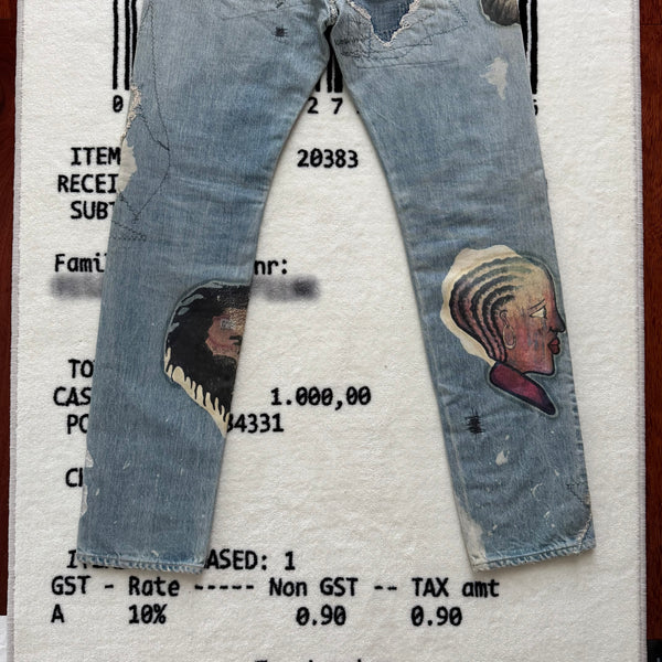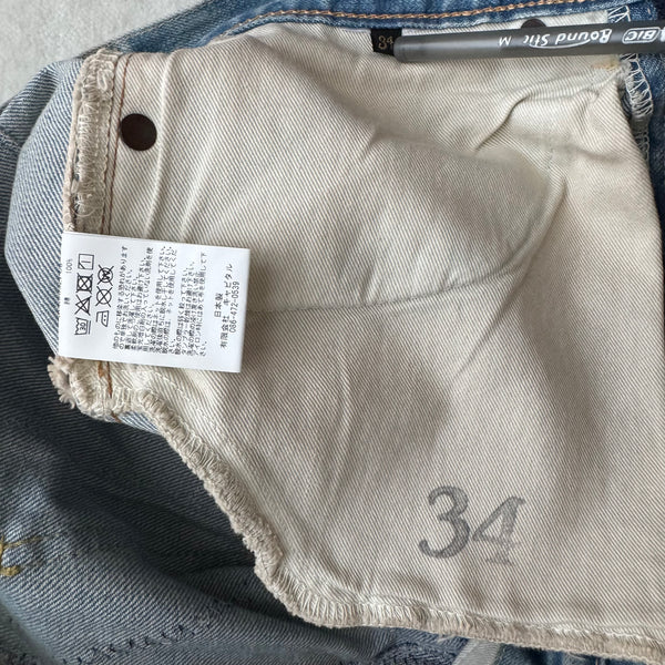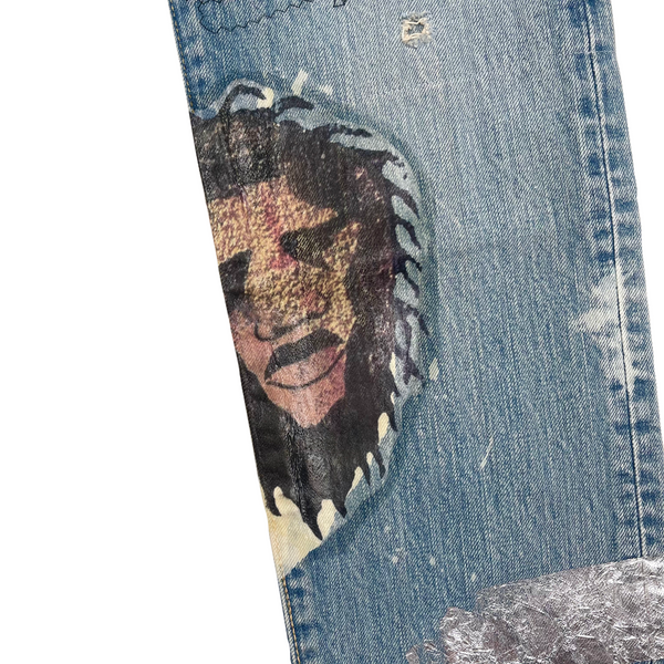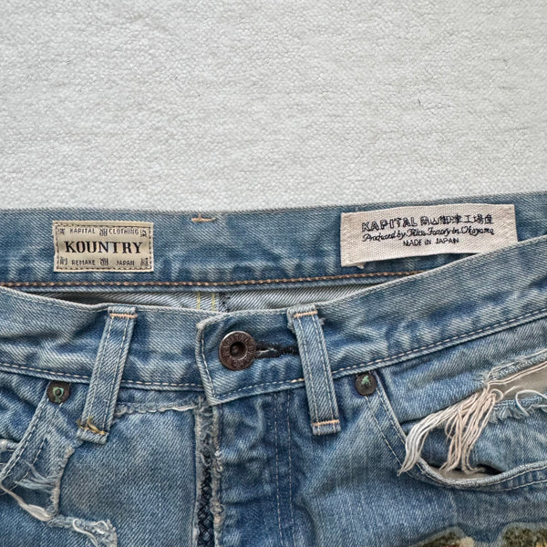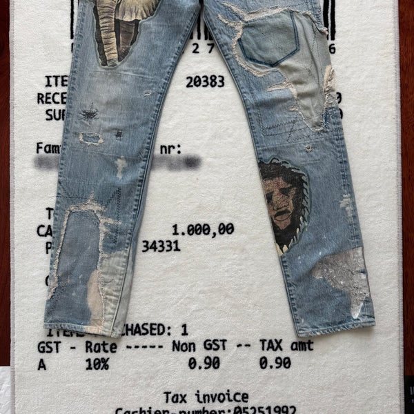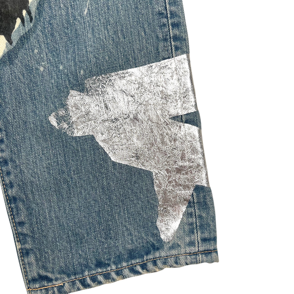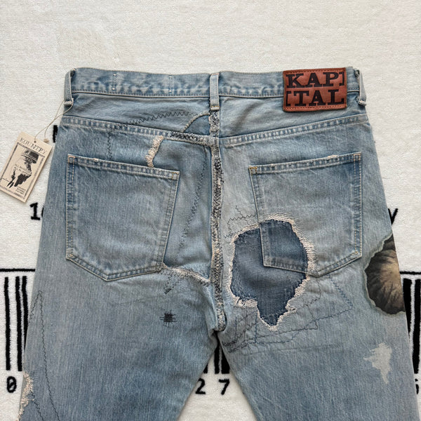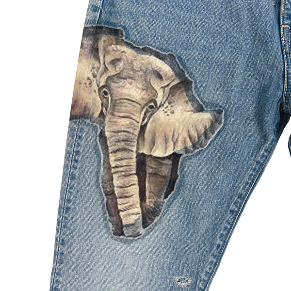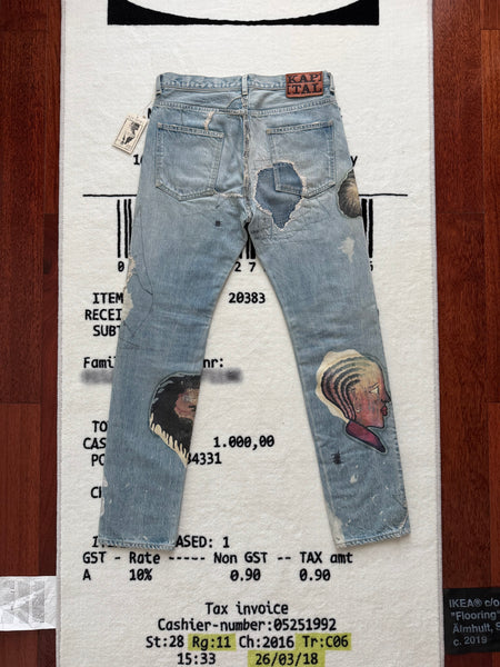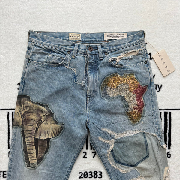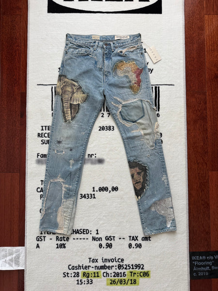 Description: One of the most limited Kountry pair ever produced. It was only released one pair per size in 3 stores in Tokyo. The garment was themed by Africa, it was printed with differentially designed Africa continents, combined with animals and other elements. The denim was also detailed with washing, distressing, patching, stitching, and bleaching process, using unique methods by the brand.