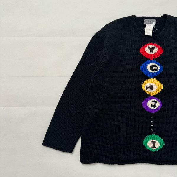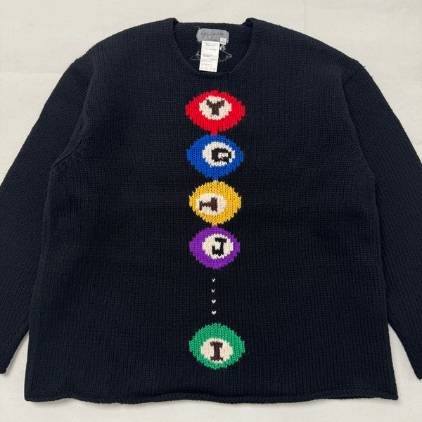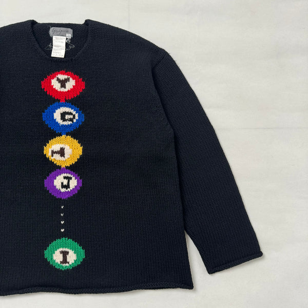 Detail: Colorful billiards with ‘Yohji’ signature, cut-off sleeve & hem.